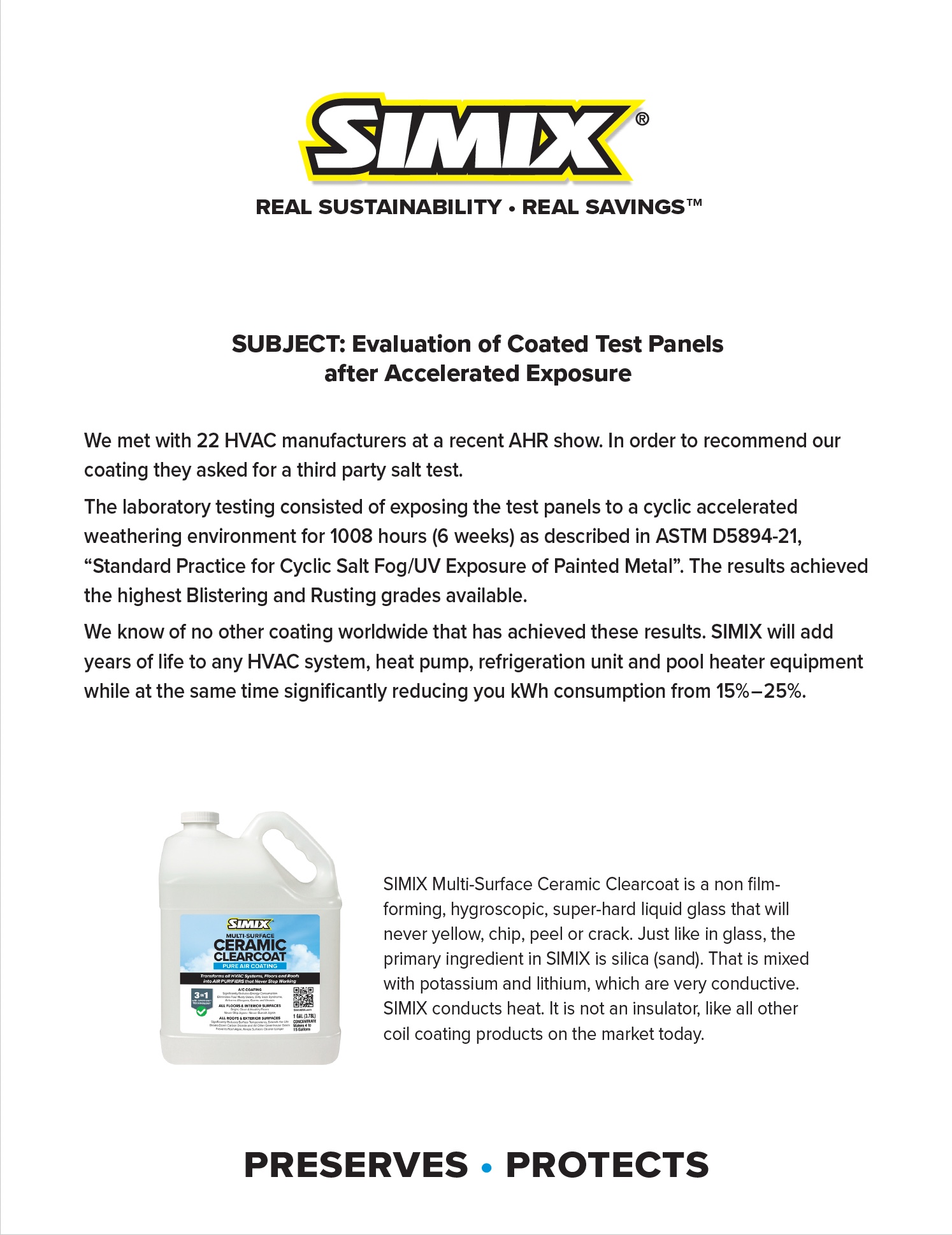 The SIMIX Salt Test is a standardized corrosion-resistance evaluation designed to measure how effectively SIMIX ceramic coatings protect treated surfaces in harsh, salt-rich environments. In this test, coated and uncoated substrates are exposed to a controlled salt-fog or salt-spray environment that accelerates corrosion, simulating years of exposure to moisture, salinity, and airborne contaminants. Results consistently demonstrate that SIMIX-treated surfaces significantly resist oxidation, corrosion, and material degradation for much longer than untreated surfaces. This performance confirms the coating’s ability to form a durable, protective barrier that limits moisture intrusion and chemical attack—making SIMIX well-suited for HVAC systems, coastal facilities, industrial equipment, and other applications where corrosion protection is critical to performance, longevity, and energy efficiency.