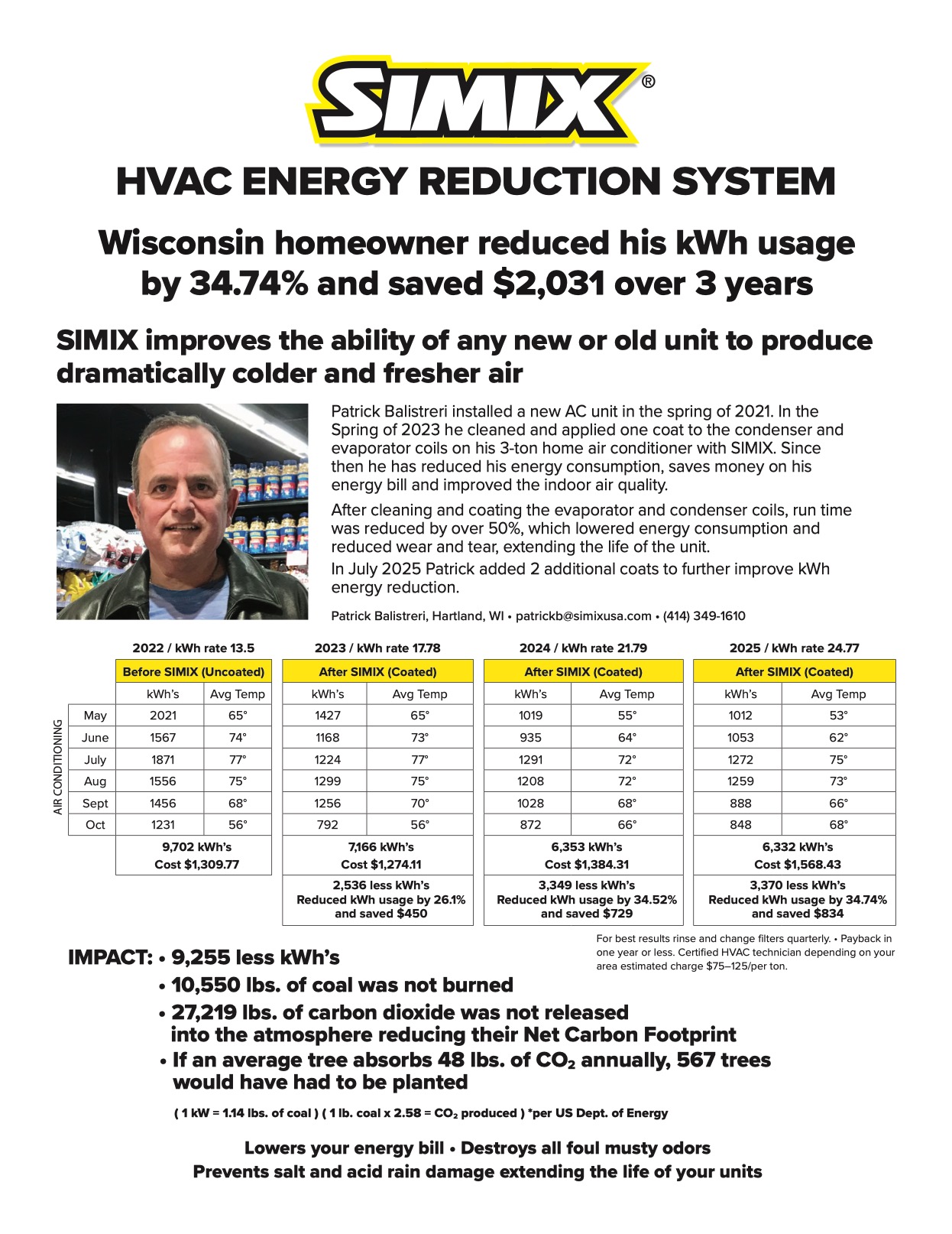 Patrick Balistreri installed a new AC unit in the spring of 2021. In the Spring of 2023 he cleaned and applied one coat to the condenser and evaporator coils on his 3-ton home air conditioner with SIMIX. Since then he has reduced his energy consumption, saves money on his energy bill and improved the indoor air quality.