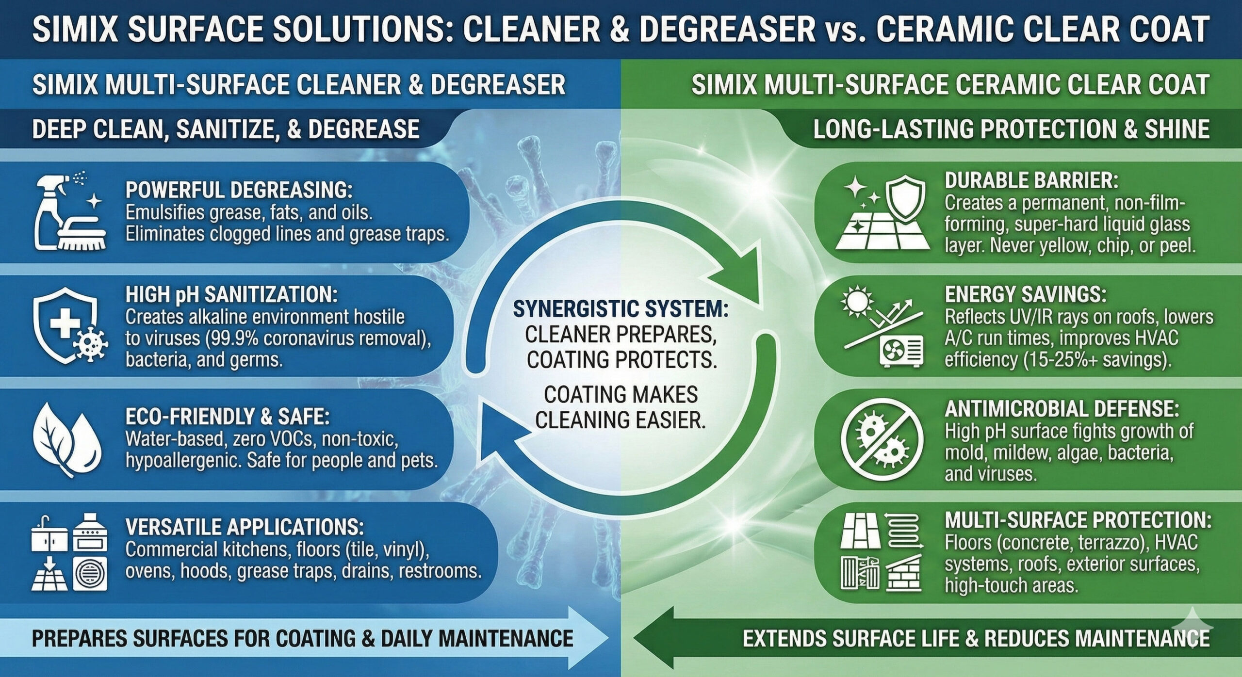 SIMIX Multi-Surface Cleaner is a revolutionary powder concentrate that harnesses the power of high-pH oxygen to deep-clean, degrease, and sanitize. Unlike traditional detergents that leave behind sticky residues, SIMIX leaves surfaces chemically clean and resistant to re-soiling.
